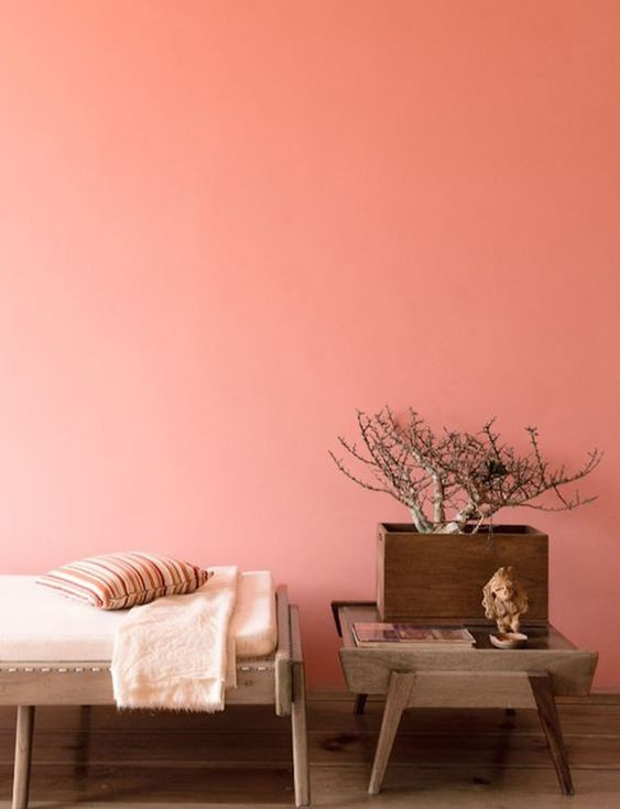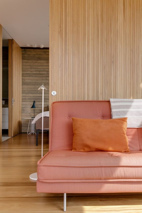 Ambiente composto por sobretons Living Coral e madeira clara.
