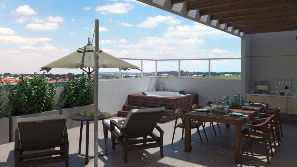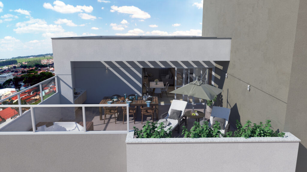 As coberturas terão 2 apartamentos de 105,96 m². São 56,45 m² de área privativa com 2 dormitórios (1 suíte), mais terraço de 49,51m², com SPA e área gourmet. As coberturas possuem sala de estar/jantar, cozinha, área de serviço, hall, suíte, dormitório e banheiro social.